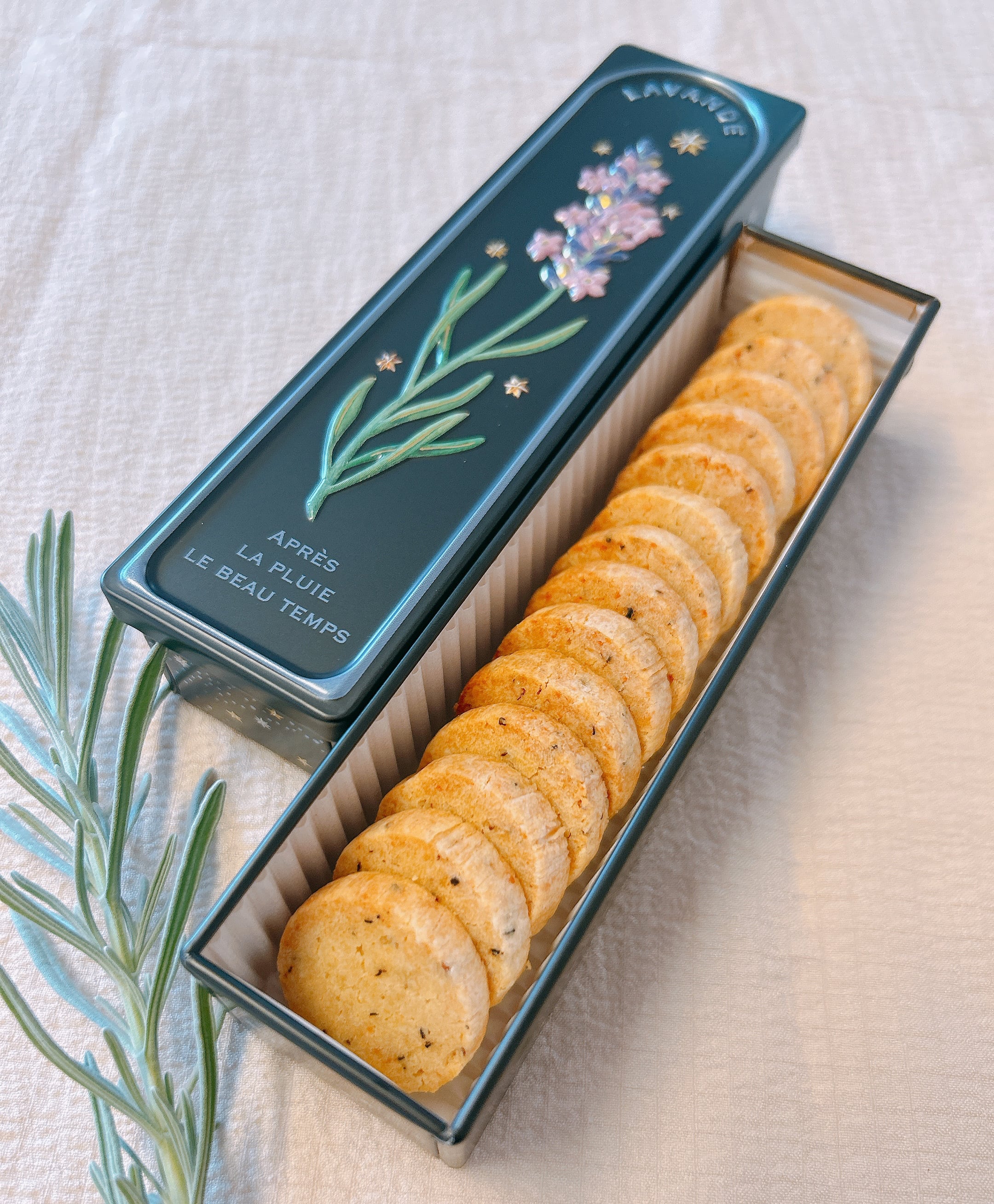 ラベンダーの缶に黒胡椒とチーズのクッキー14枚入りです。